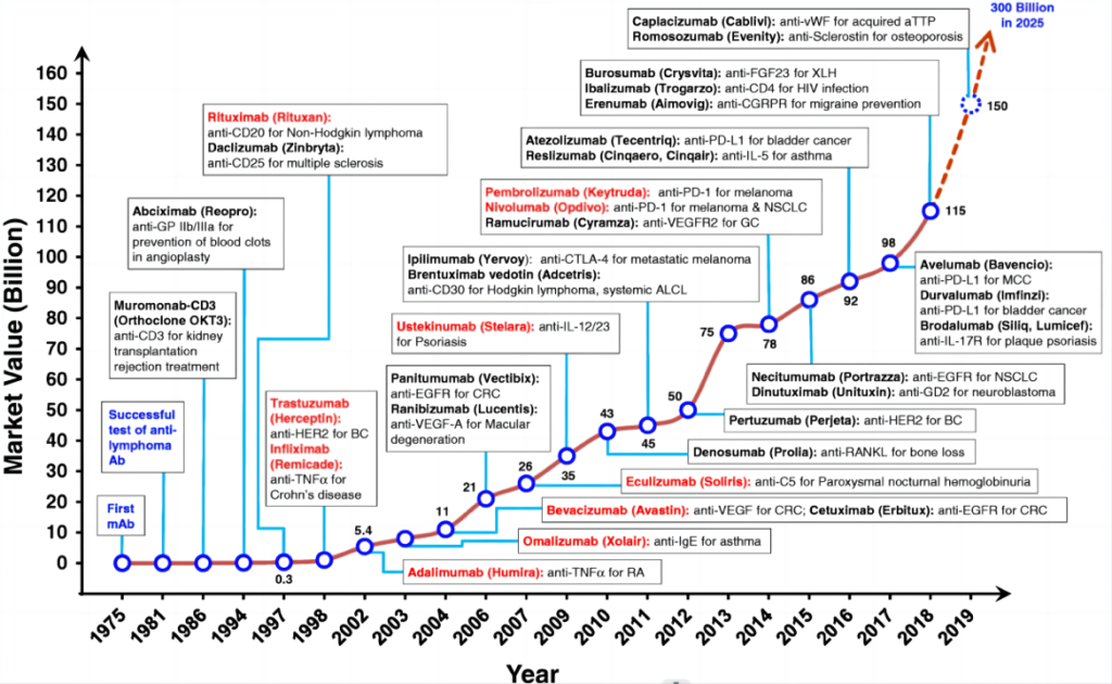 1975年,英國科學家Kohler和Milstein 首次將壽命長但不能產(chǎn)生特異性抗體的小鼠骨髓瘤細胞與壽命短但經(jīng)免疫后可產(chǎn)生特異性抗體的漿細胞(綿羊紅細胞免疫的小鼠脾細胞)在體外進行融合,創(chuàng)建了雜交瘤技術,得益于該技術,mAbs才實現(xiàn)了大量制備,用于基礎研究,并具備臨床轉(zhuǎn)化能力,開啟了單克隆抗體藥物開發(fā)的新紀元。