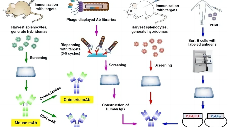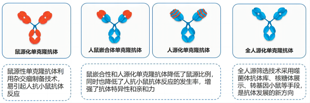 單克隆抗體的發(fā)展主要經(jīng)歷了四個階段:鼠源性單克隆抗體、人鼠嵌合性單克隆抗體、人源化單克隆抗體和全人源單克隆抗體。由于鼠源性抗體適用于人體時總會產(chǎn)生這樣那樣的不良反應,因此人源化抗體才是未來藥物的發(fā)展趨向。