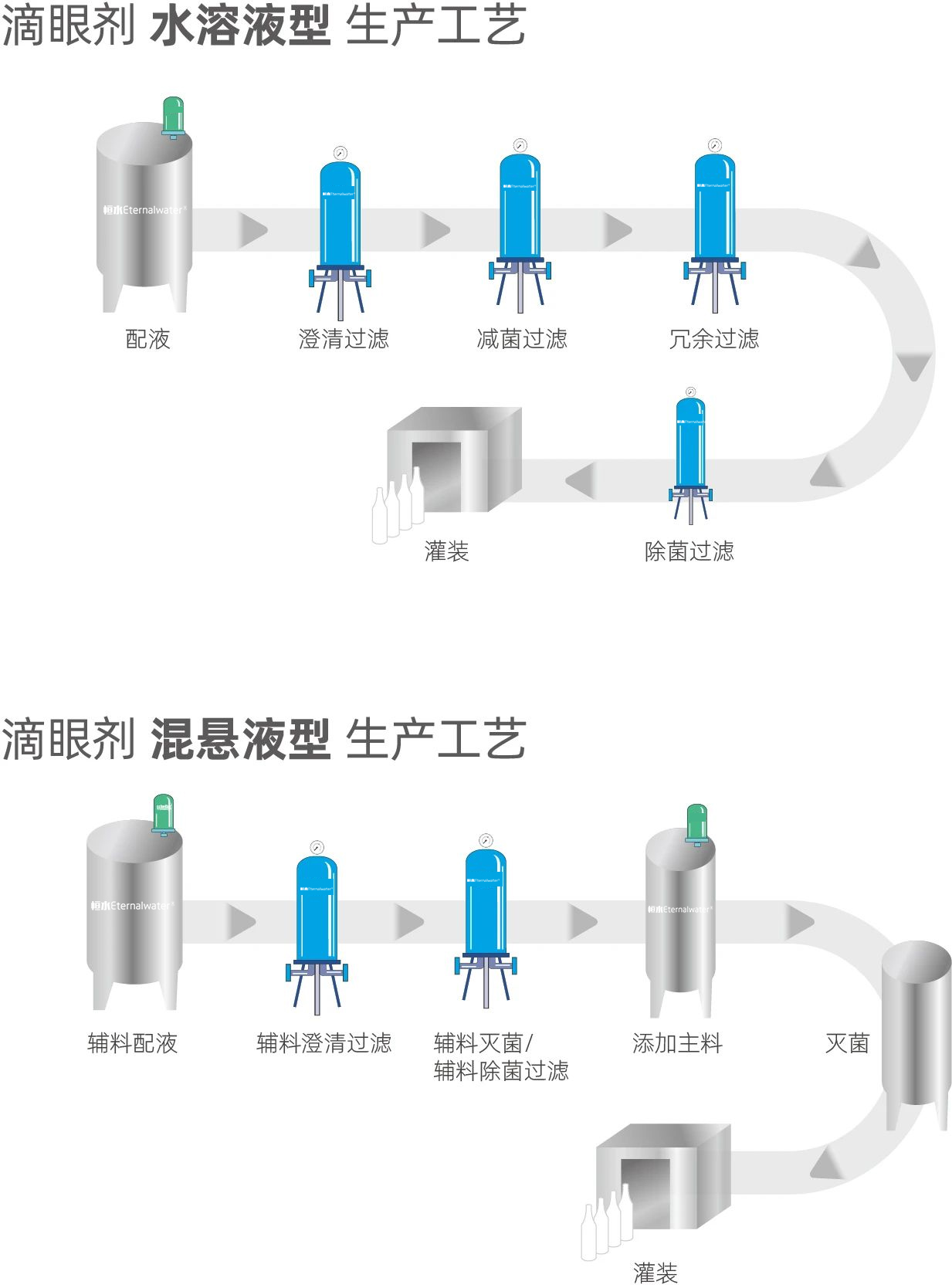 《中國藥典》2020年版通則0105眼用制劑中描述“滴眼劑系指由原料藥物與適宜輔料制成的供滴入眼內的無菌液體制劑”。在滴眼劑的生產過程中需要將注射用水與藥物混合,然后制成滴眼劑進行成品灌裝,分為澄明溶液、混懸液或乳狀液;也可將藥物以粉末、顆粒等形式包裝,另備溶劑,在臨用前配成澄明溶液或混懸液。