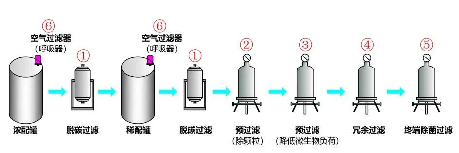 在整個(gè)大、小容量注射劑不同工藝階段過(guò)濾都有著非常廣泛的應(yīng)用,主要有脫碳過(guò)濾、除顆粒和降低微生物負(fù)荷的預(yù)過(guò)濾、氣體的除菌過(guò)濾、冗余過(guò)濾和終端產(chǎn)品的除菌過(guò)濾等,主要的過(guò)濾位點(diǎn)有: