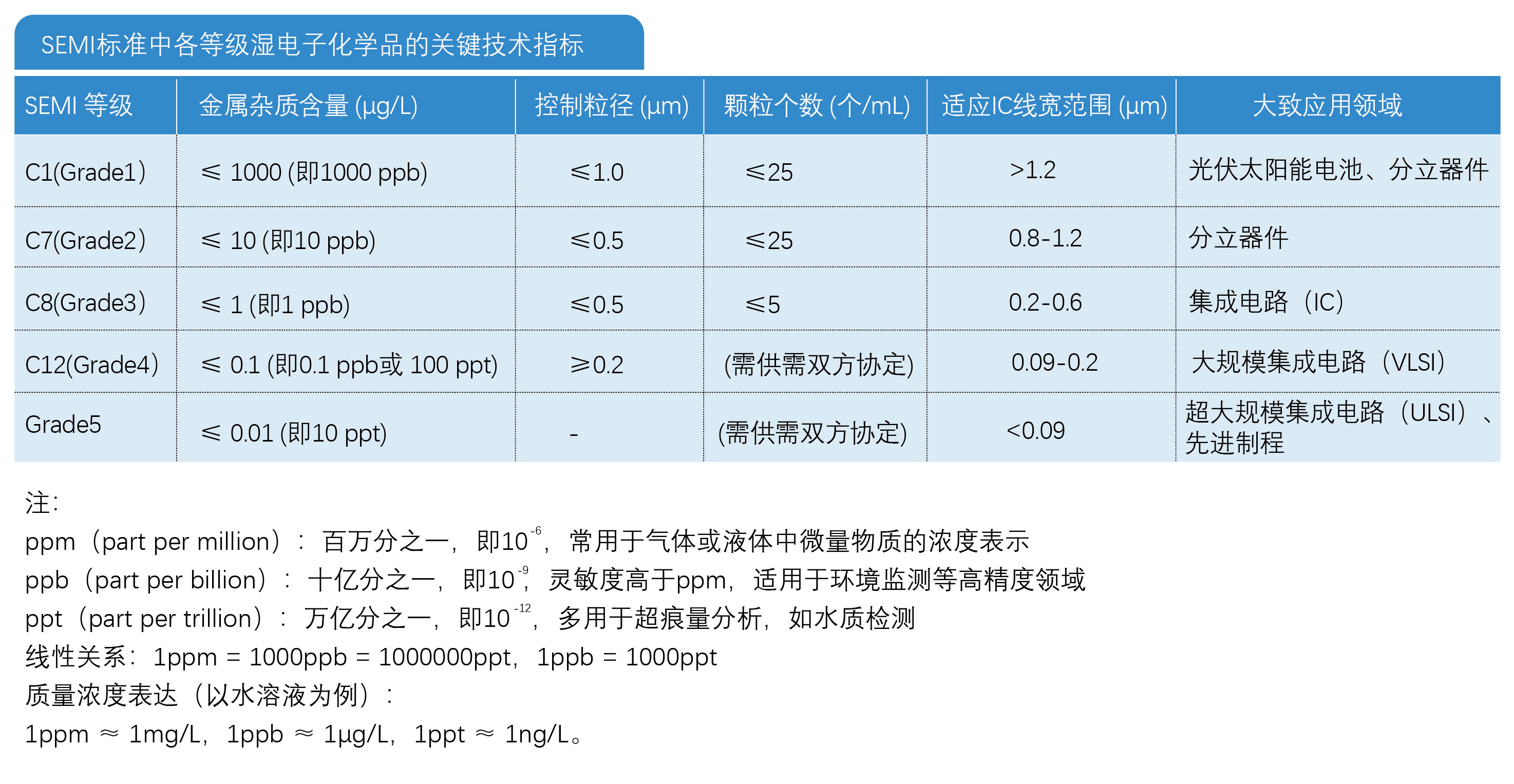 濕電子化學品又稱工藝化學品,是指主體成分純度大于 99.99%,塵埃顆粒粒徑控制在 0.5μm 以下,雜質含量低于ppm級的化學試劑,是目前所有化學試劑中對顆粒控制、雜質含量要求最高的試劑。濕電子化學品主要作用為清洗劑被廣泛應用于微電子、光電子濕法工藝中,其核心要素為超高潔凈度和超低雜質含量,因而它對原料、純化方法、配方工藝、容器、生產設備、環境控制、測試和運輸設備等都有極為嚴格的要求。為了區分不同等級的濕電子化學品,國際半導體設備和材料組織(SEMI)通過濕電子化學品中金屬雜質含量、控制粒徑范圍和顆粒個數等各項指標將濕電子化學品劃分為 G1-G5 五個等級,其中G5 等級的濕電子化學品要求最高,金屬雜質濃度需達到10ppt級別,一般用于半導體行業高端集成電路,對應 12 英寸的晶圓制備為主。G1等級的濕電子化學品要求最低,金屬雜質濃度僅需達到10ppm級別,控制粒徑大于等于1.0 μm,顆粒個數小于等于25個/mL 即可,對應下游行業為分立器件和太陽能電池板。中間的G2-G4等級濕電子化學品主要用于面板行業和半導體行業中中低端集成電路。
