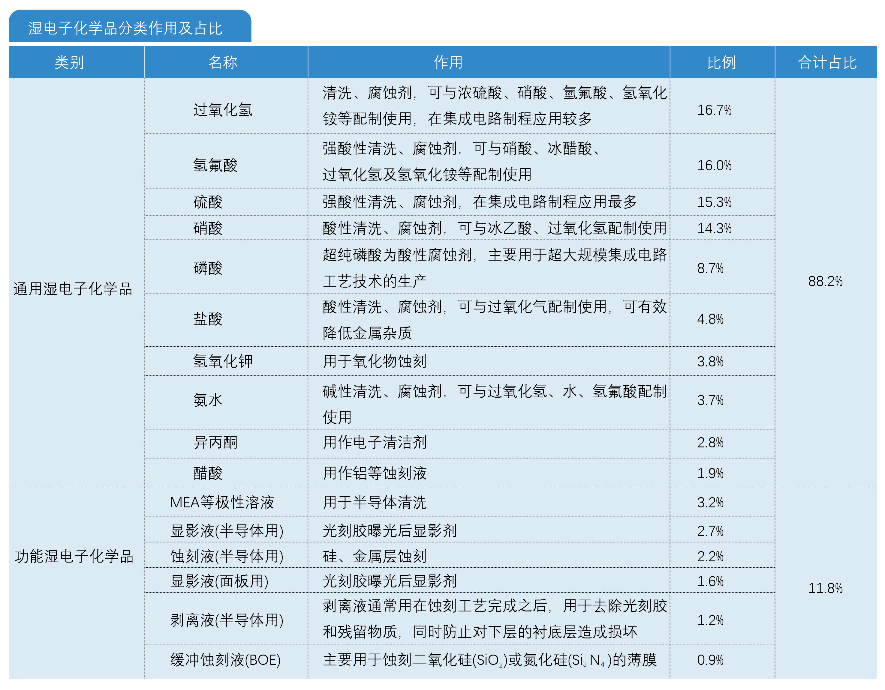 根據觀研報告網發布的《中國濕電子化學品市場發展態勢分析與投資戰略預測報告(2023-2030年)》顯示,從大類來分,一般可劃分為通用濕電子化學品和功能濕電子化學品。根據中國電子材料行業協會數據,通用濕電子化學品占比88.2%,其中過氧化氫占比16.7%,氫氟酸占比16%,硫酸占比15.3%,硝酸占比14.3%。功能濕電子化學品占比11.8%,其中MEA等極性溶液占比3.2%,顯影液(半導體用)占比2.7%,蝕刻液(半導體用)占比2.2%。