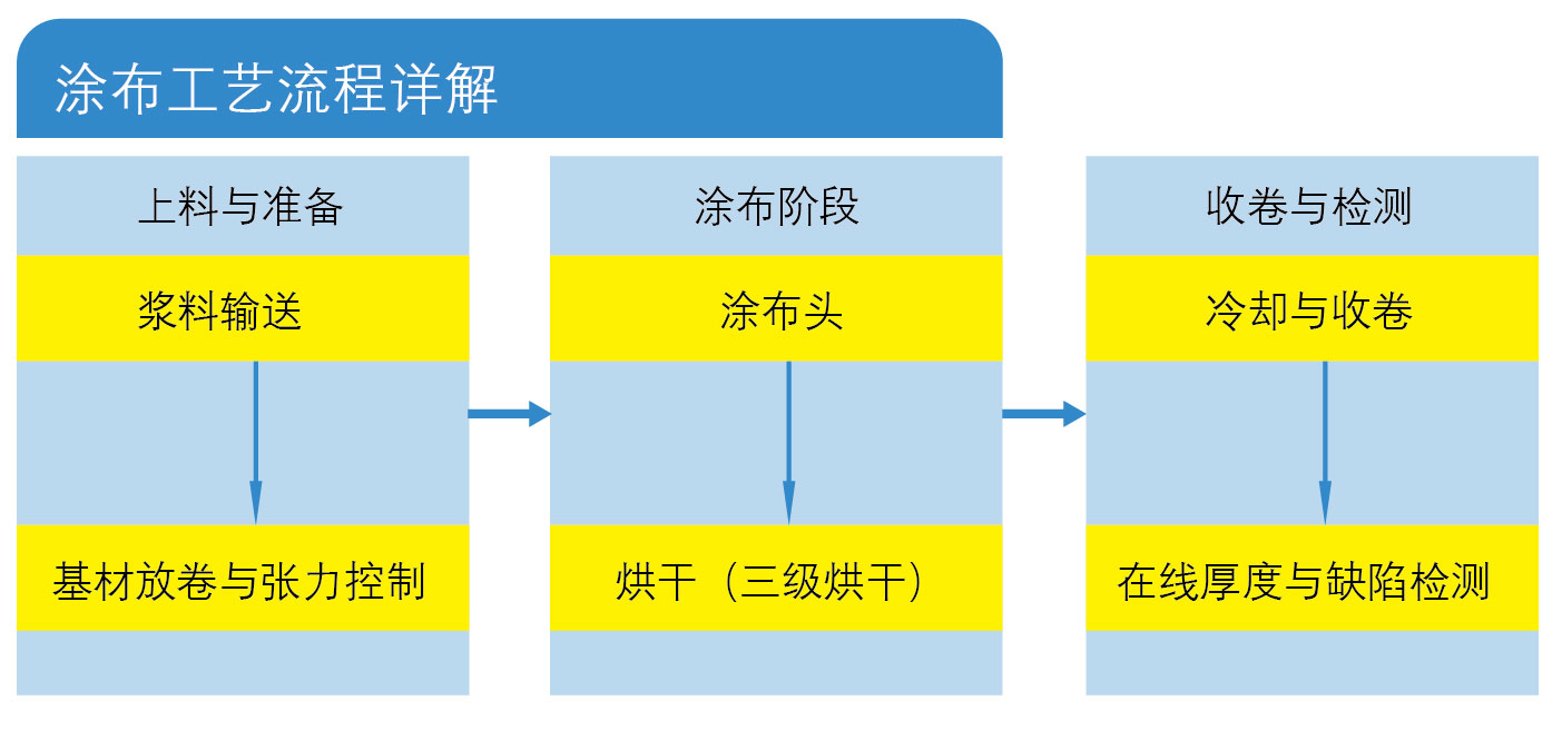 鋰離子電池電芯由陽極、陰極、電解液、隔膜和其他部件組成。鋰離子電池的工作原理可以簡單描述為:鋰離子在陽極和陰極之間移動,從而在充電和放電過程中攜帶并儲存電子。 在整個制造過程中,涂布是電池電芯制造關鍵步驟。 將攪拌均勻的漿料(活性物質、導電劑、粘結劑等的混合物)均勻、連續、穩定地涂覆在金屬集流體(正極用鋁箔,負極用銅箔)上,并烘干溶劑,形成厚度一致、無缺陷的極片。 涂布工序直接決定了電池的容量、一致性、安全性和壽命。可以說,涂布質量是電池高性能的基石。